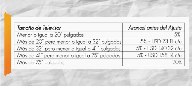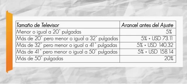 El impuesto, anteriormente era del 20%, será mixto: de un 5% más un valor en dólares por unidad de USD 158,14. Para los televisores extragrandes de más de 75″ pulgadas se gravan con 20%.